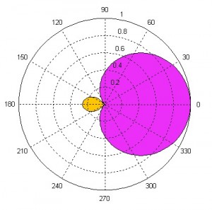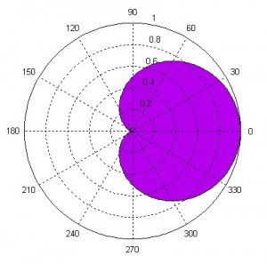 C’est l'une des directivités la plus utilisée en prise de son, elle rejette quasiement tout ce qu’il y a à l’arrière du micro avec un taux de réjection maximum à 90° et à 270° Le diagramme violet reprensente la sensibilité dans le plan, une sensibilité de 1 ( ou 100%) dans l’axe du micro (0°), une sensibilité de 0,5 soit 50% sur les côtés et de 0 soit 0% à l’arrière du micro.